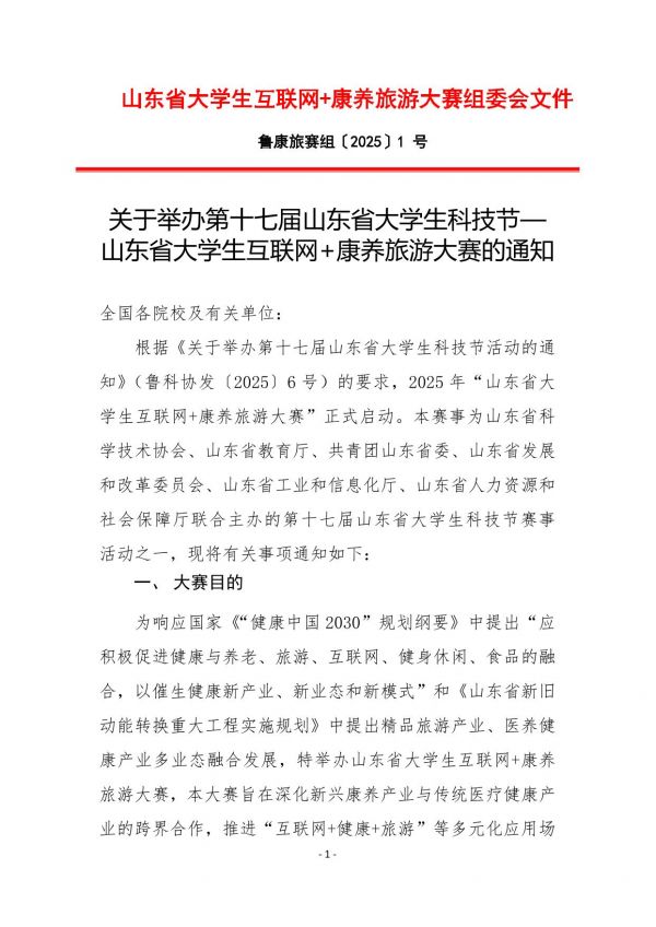 根據(jù)《關(guān)于舉辦第十七屆山東省大學(xué)生科技節(jié)活動的通知》(魯科協(xié)發(fā)〔2025〕6 號)的要求,2025 年“山東省大學(xué)生互聯(lián)網(wǎng)+康養(yǎng)旅游大賽”正式啟動。本賽事為山東省科學(xué)技術(shù)協(xié)會、山東省教育廳、共青團山東省委、山東省發(fā)展和改革委員會、山東省工業(yè)和信息化廳、山東省人力資源和社會保障廳聯(lián)合主辦的第十七屆山東省大學(xué)生科技節(jié)賽事 活動之一,現(xiàn)將有關(guān)事項通知如下: