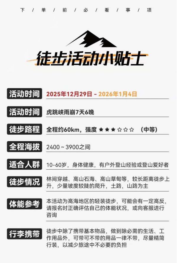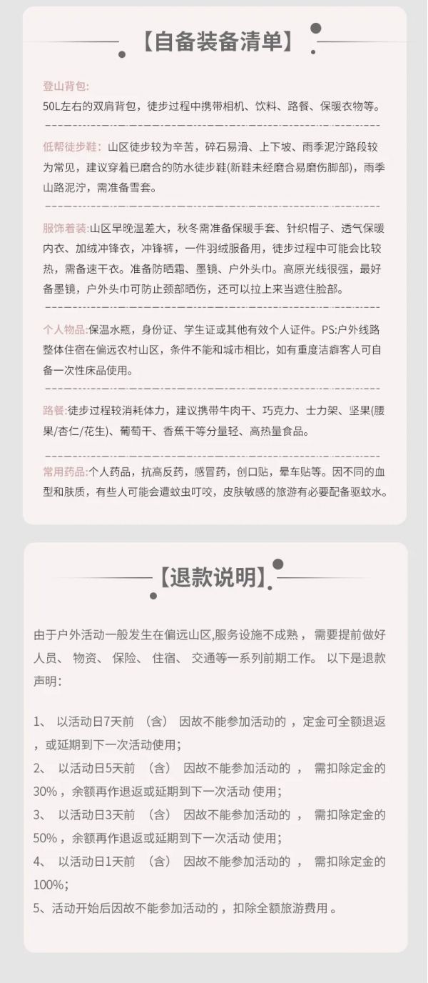 徒步路線較為偏遠,條件有限,主辦方有權(quán)根據(jù)具體房態(tài)進行調(diào)整
