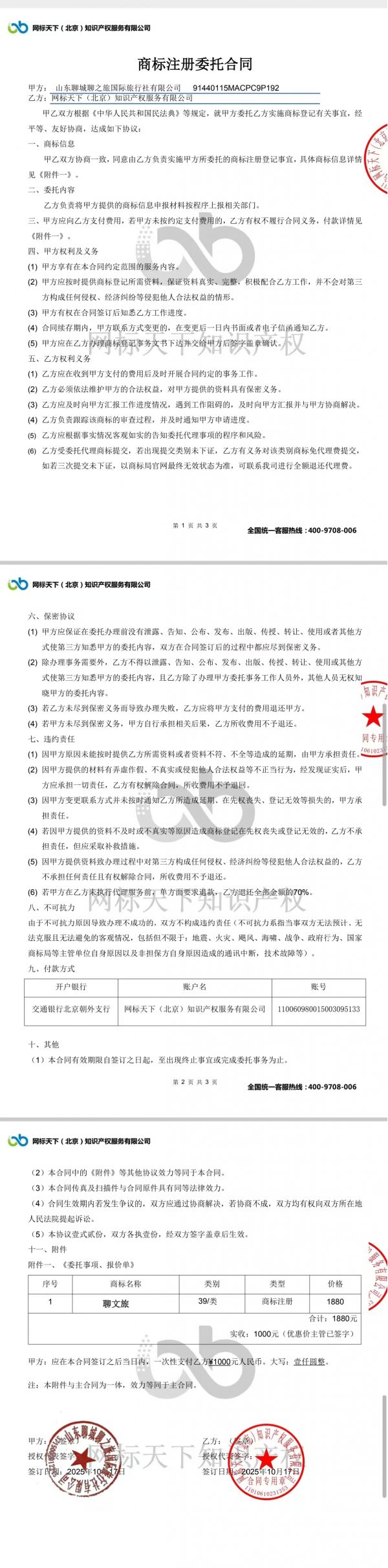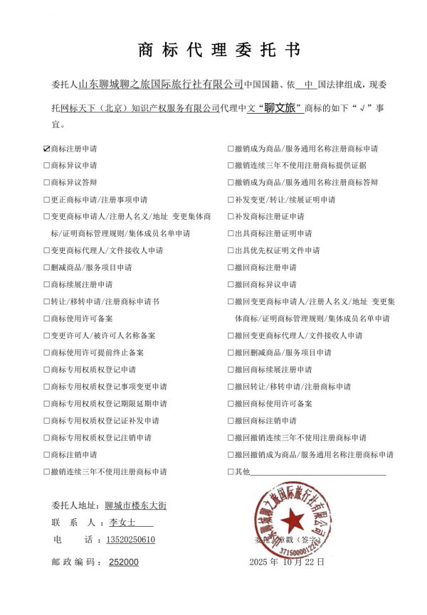 2025年10月22日山東聊城聊之旅國際旅行社有限公司委托網(wǎng)標(biāo)天下(北京)知識產(chǎn)權(quán)服務(wù)有限公司代理中文“聊文旅”商標(biāo)事宜。